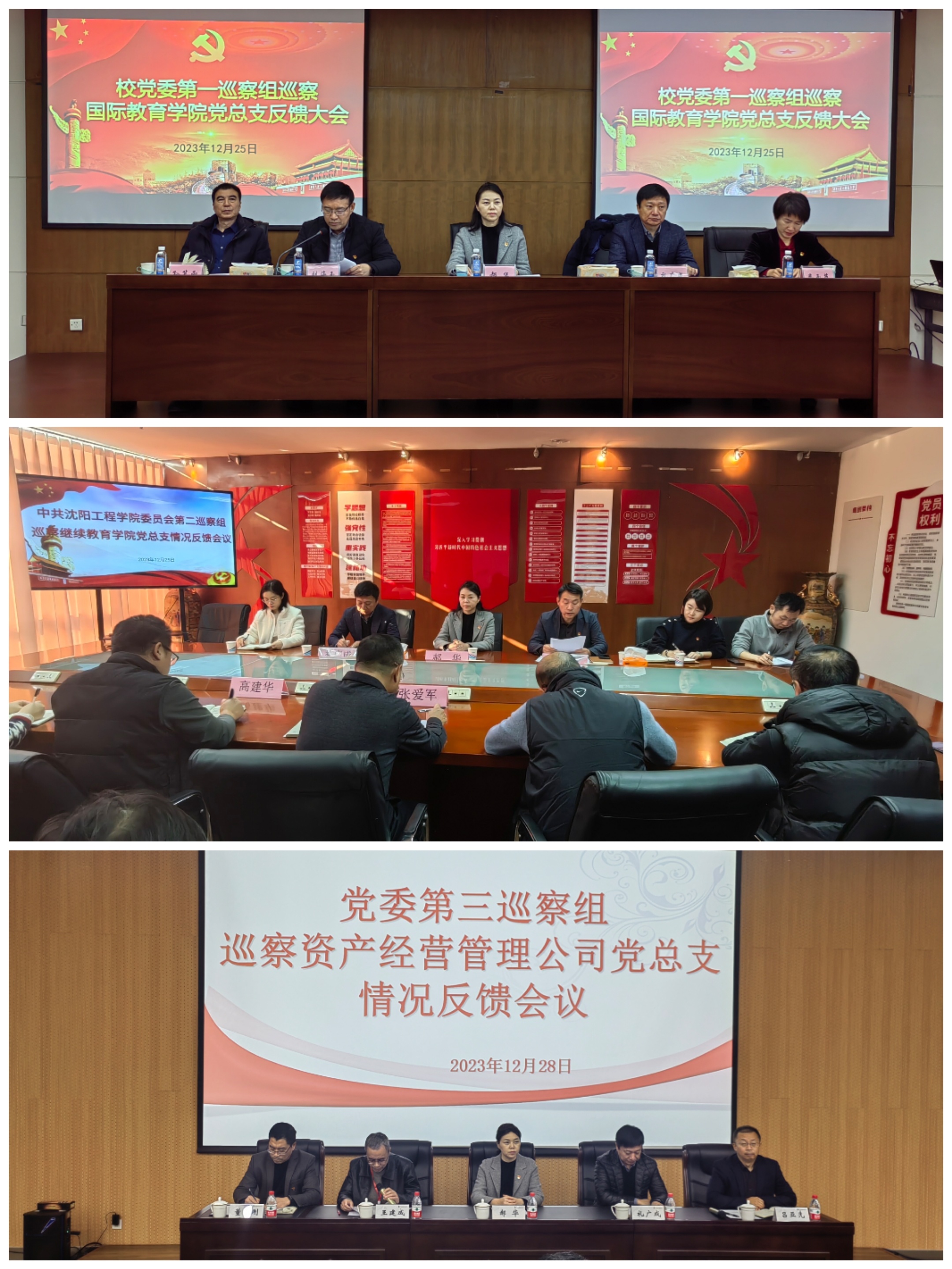 党委第一巡察组组长刘海玉、第二巡察组组长裴荣杰、第三巡察组组长王建成分别向国际教育学院党总支、继续教育学院党总支、资产经营管理公司党总支反馈了巡察意见,就问题整改提出了意见和建议。